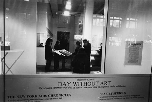1995—New Museum of Contemporary Art in New York on December 1 of that year, the sixth Day Without Art. The Chronicle was displayed in the lobby and visitors to the museum turned its pages at a rate determined by the number of AIDS deaths that year with each turn of the page representing a person that had died. This interactive display was positioned to occupy the Museum’s street-level display window, thereby bringing its message to the thousands of people who passed by the window on a daily basis.