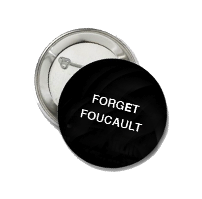 Forget Foucault builds on the tradition of disseminating political, commercial and/or artistic ideas through a wearable object. Since the button badge was invented in the late 1800’s, these seemingly innocuous objects have been used for everything from supporting political campaigns to advertising products to helping to fuel artistic projects. As economic, portable and wearable signposts, buttons have helped to spread the ideas that fueled the hippie movement of the 1960’s and the punk movement of the 1970’s and 80’s, and many of the major election campaigns of the twentieth century. Thus in this way, buttons have served as a form of social catalyst, a means for the spread of both suppressed and idealized notions. Further, Forget Foucault also draws on related artistic precedents such as the work of Yoko Ono, Keith Haring, and most notably, that of Daniel J. Martinez’s, who’s Whitney Biennial buttons sought to interrogate the hierarchies of our linguistic, socio-political and socio-physical interactions by giving visitors buttons that contained portions of a sentence that together formed the charged sentiment “I can’t ever imagine wanting to be white.”